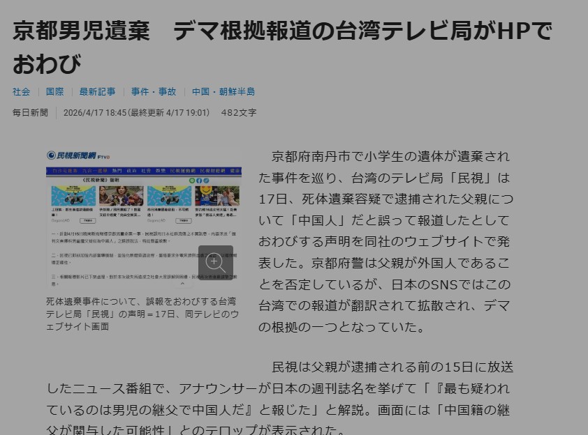京都男児遺棄 デマ根拠報道の台湾テレビ局がHPでおわび | 毎日新聞