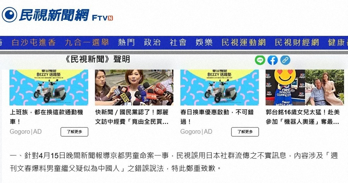 台湾人「京都男児事件 デマを流した台湾の民視TVが正式に謝罪」