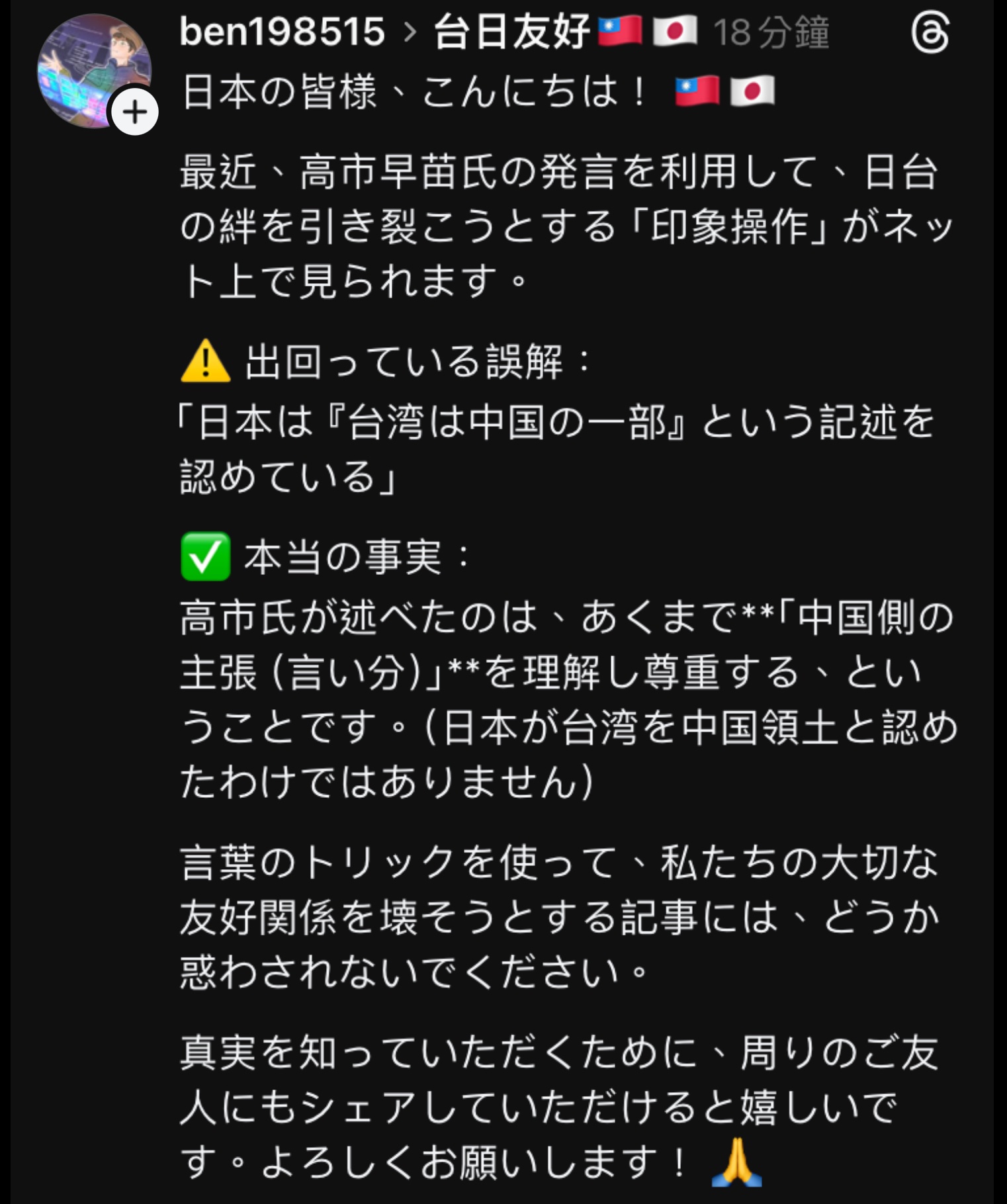 台湾人「高市早苗がトーンダウン「台湾は中国の領土であり、分割できない一部」」