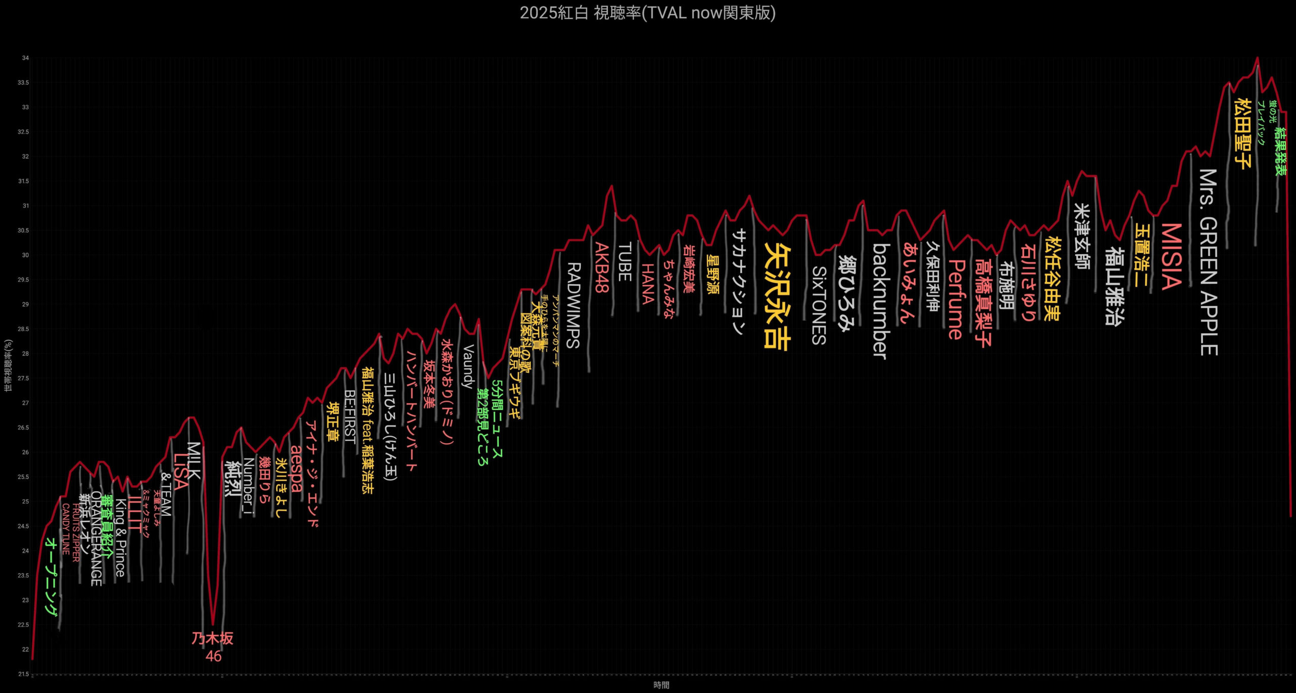 今年、歌手別で最も視聴率が高かったのは松田聖子で、34%。